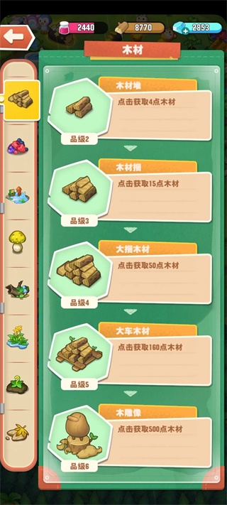 木材的来源也很多,有梧桐树,13级梧桐树可以得到4级木材,参加莲花季节的合作伙伴也可以用大莲花做布丁吃,得到一些木材和环保袋,通过和任务,商店。