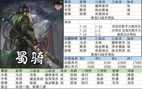 蜀骑,自开发以来,蜀骑从未被主五淘汰,因此也有一个衍生的土地复垦团队。然而,土地复垦团队的缺点非常明显,即缺乏资源,铁和粮食消耗非常高。玩家很难掌握土地复垦的节奏,这限制了他进一步提高排名