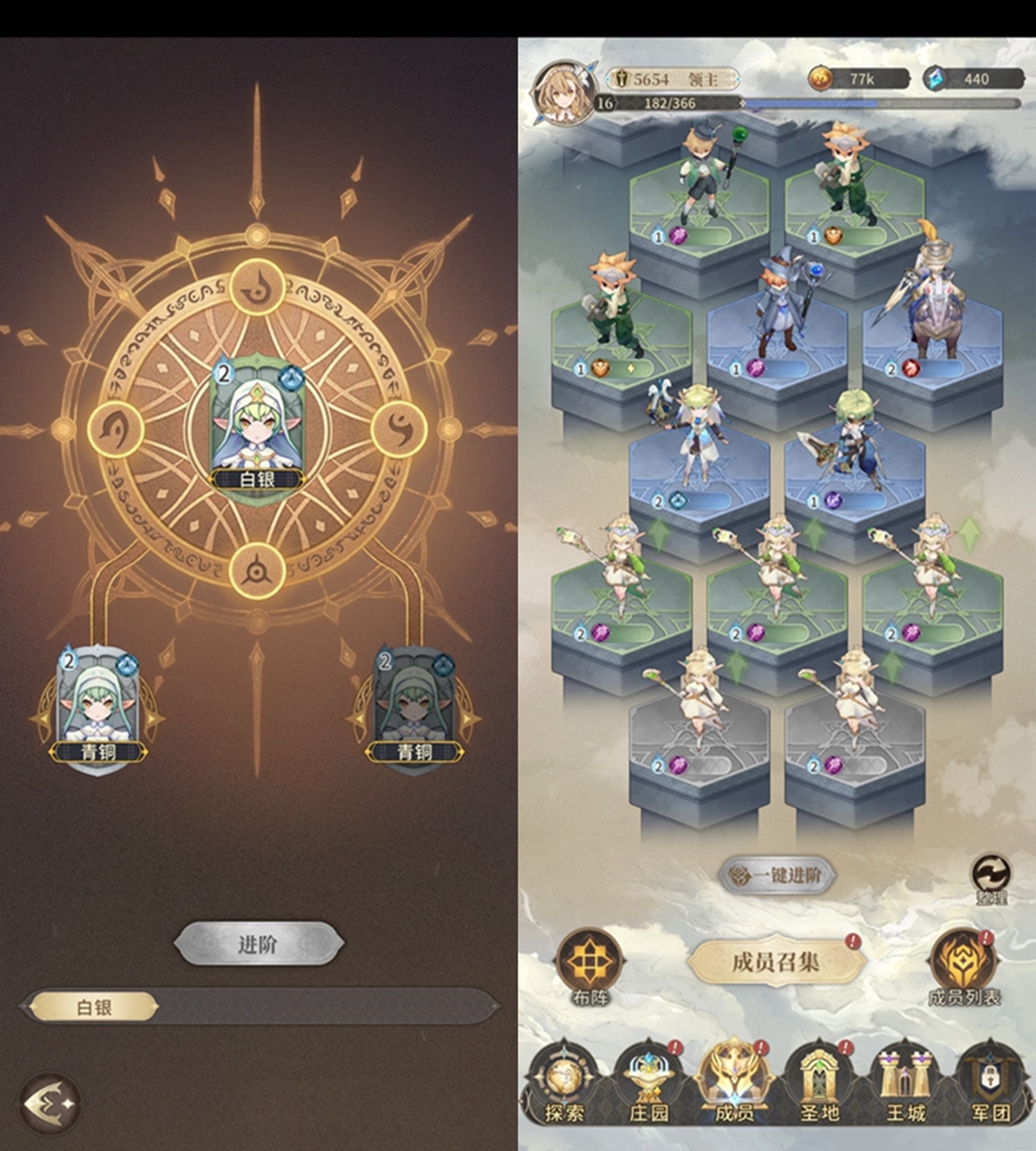 当我们在成员大厅召集相同级别的成员时,我们可以使用成员页面中的先进功能,使两个相同级别的成员合成先进。成员级别从青铜、白银、黄金、铂金、钻石、圣域、传奇和半神分为八个级别。每个级别需要提高的次数也会增加,上述成员级别的上限也取决于成员级别。高级也可以通过在召集大厅拖动相同等级的成员来完成。手动拖动30次后,我们还可以解锁“一键高级”功能,非常方便。等级提升后,角色的基本属性会有质的飞跃。如果你在冒险中被卡住了,不妨试着召集成员来提升团队成员的等级。