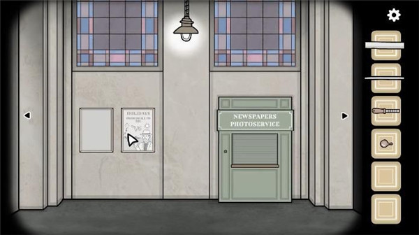 9、去海报旁边的摄影棚,安装把手,打开窗帘,得到报纸。把报纸给坐在长椅上的男人,点击他右边的口袋,看报纸时得到硬币。