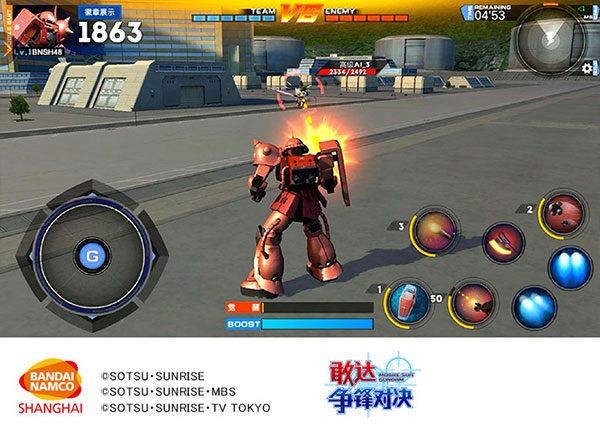 敢达战斗的主要动作风格,采用3D物理碰撞、应力反馈、重力补偿、动态镜头等下一代技术,完美模拟驾驶敢达战斗的控制体验。实现移动、侧滑、喷射、飞行、射击、格斗、格栅、控制、浮动连接等多元化的战斗效果,扭转您以往的动作手机游戏体验!