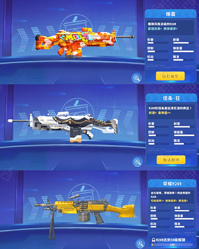 除了传统的M249,你还可以通过改装和涂装来改善你的枪的功能!目前有爆震/信条-狂/荣耀M249三种枪皮。