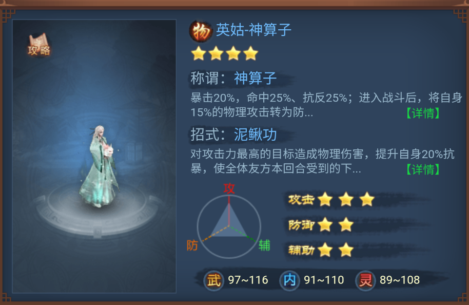 郭归属于一名技能型将军。初始暴击较高,自带减伤。根据目前的情绪变化,除了造成伤害外,他还可以治疗队友。他应该优先考虑内力以获得更高的技能伤害。核心设备是书籍