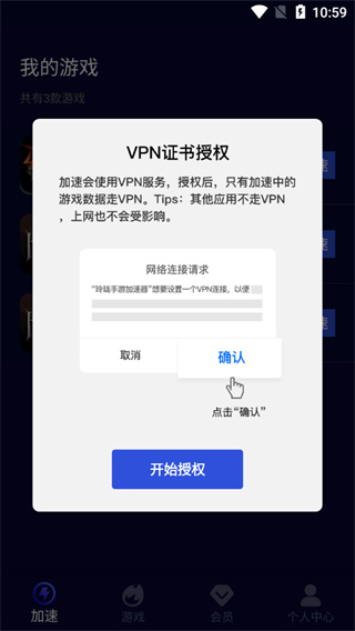 2、进入软件主页可以看到您的个人游戏列表,选择游戏加速确认授权vpn;