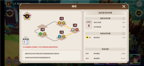 1、主线水平采用常见的放置形式,战斗基本上会自动进行,玩家只需要放角色技能,所以游戏的重点是团队安排,选择不同的阵型会有不同的奖励效果,英雄之间的国家关系和个性契合也会影响奖励,感觉太复杂直接使用系统自动编队不会有问题~