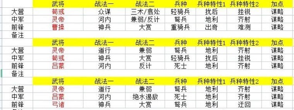 1)“潜龙在渊”组合:部队武将组合孙坚、曹操、刘备,加上“攻击”属性;