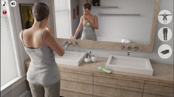 7、刷牙后,从浴室出来,点击穿上衣服,点击图箭头离开房间