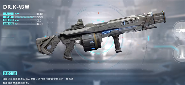 在前方范围内进行6次核磁打击,预警后发光柱攻击造成一定范围内的范围伤害,由于Dr.K-毁星的动力来源于枪托内动力感应装置转化无壳弹药发射时的能量,因此Dr.K-毁星配备了大型弹夹