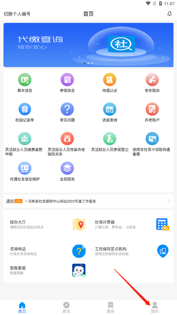 1、“主页”集中显示常用功能,包括基本信息、待遇资格认证、服务网点、咨询电话等。