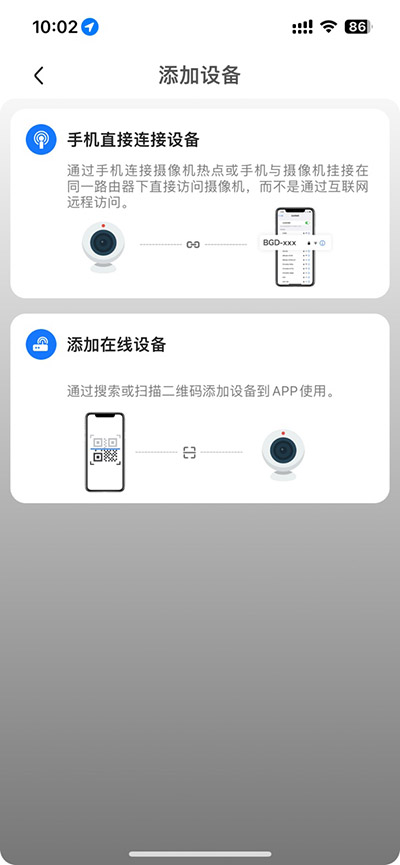 1、可在相机页面选择手机直接连接设备,也可点击以下添加设备;