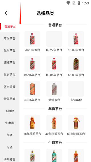 2、进入类别界面,根据葡萄酒类别选择相应的分类