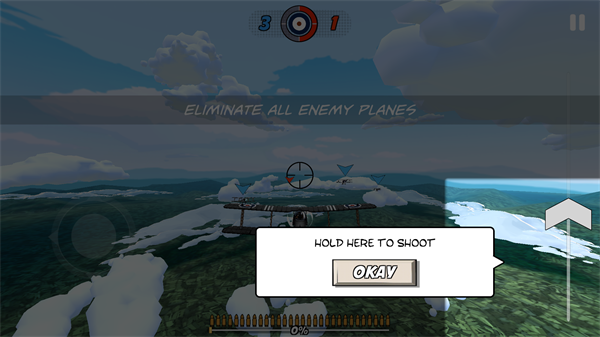 游戏开始就提供给玩家几种操作方案,默认是体感操作,不过玩起来会导致玩家的吃相非常难看,采用摇杆操作就稍微斯文一些了,不过为了体验原汁原味的空战感觉采用了默认的体感操作,通过晃动手机就可以控制战机的飞行方向了,画面右下角点触后可以射击,画面右上角触摸可以重装子弹,点触敌方红色箭头可以在视角上追踪他们,一旦敌人进入到战机的瞄准圈内就可以愉快的射射射了,游戏为了方便玩家在手机上操作,采用了模糊跟踪功能,即一旦锁定过敌机后不断射击时玩家战机会自动追踪敌机一段时间,抓住机会干掉他们吧。