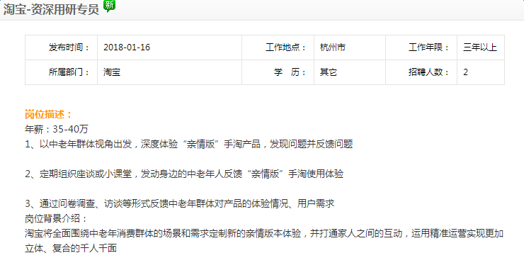这些“不走寻常路”的招聘要求是为了“亲情版”手淘而设。“资深用研专员”主要工作内容为,以中老年群体视角出发,深度体验“亲情版”手淘产品,反馈中老年群体对产品的体验情况、用户需求。