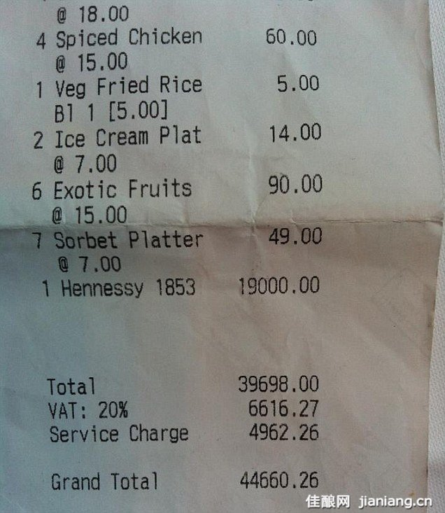 近日一条热门帖在微博上迅速传播:伦敦当地时间8月2日,英国一家网站发布了一条几乎让全世界网民都无法置信的新闻:15名奥运官员在伦敦某中餐馆一顿午餐消费高达44660.26英镑(近45万人民币)!收据中,包括一瓶高达1.9万英镑的轩尼诗白兰地(1853)。猜一猜,到底是哪个国家的奥运官员。经佳酿网小编查询,这篇文章最早出现在英国的《每日邮报》网站上,原文的标题是:Did Olympic officials blow £19,000 on a bottle of cognac? Receipt is posted online by man saying they spent £44,660 on lunch(原文链接:?ITO=1490)。这条被网友称为“钓鱼帖”的迅速引起众多网友回复,“哪个国家?你懂得”“谁能提供新闻的链接?不会又是高级黑吧?”还有网友“求辟谣”。
