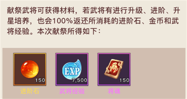 如果有用不到的武将可以遣散掉,遣散能够获得进阶石、武将经验和将魂,所消耗的资源也会百分百返还。