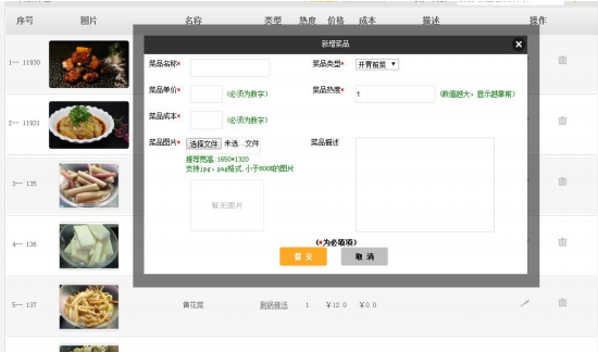 将菜名输入新菜框,选择菜品类别、菜品价格、菜品热度、菜品成本、菜品图片(图片大小不超过 800k)、菜品描述等,完成菜品新添加